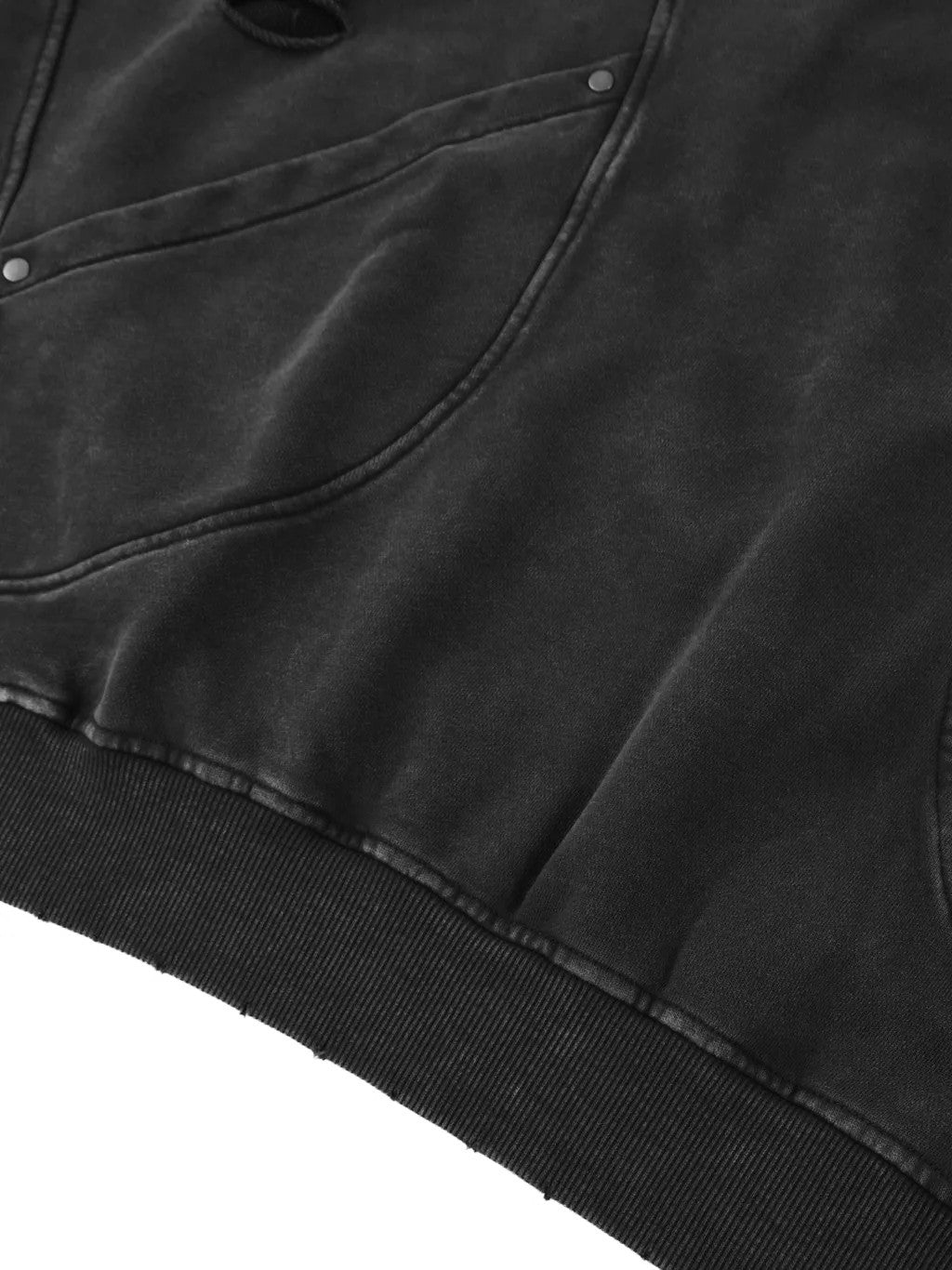 Constructed from pure, heavyweight cotton, the fabric features a substantial 420 g/m² weight, offering exceptional warmth, structure, and durability. A distinctive snow-washed finish gives each piece a subtly worn, vintage character, while intentional distressing and patchwork detailing add depth and individuality—no two garments feel exactly alike.